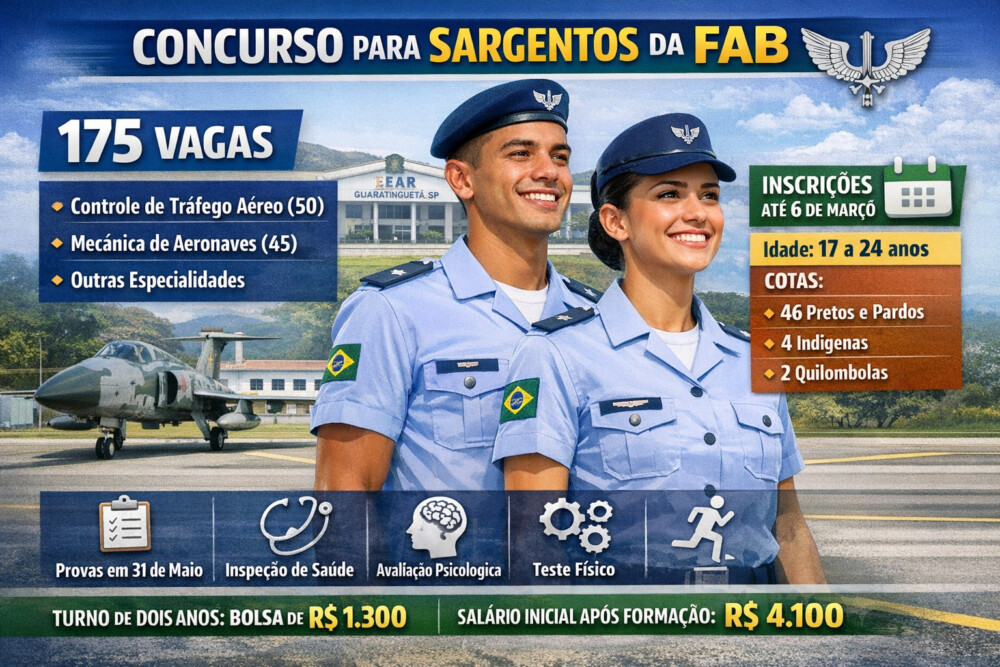 A Força Aérea Brasileira (FAB) publicou edital para o concurso de admissão ao Curso de Formação de Sargentos (CFS), oferecendo 175 vagas para candidatos de nível médio, de ambos os sexos. As inscrições estão abertas até 6 de março e devem ser feitas pelo site oficial da Escola de Especialistas de Aeronáutica (EEAR), localizada em Guaratinguetá (SP). A taxa é de R$ 100.