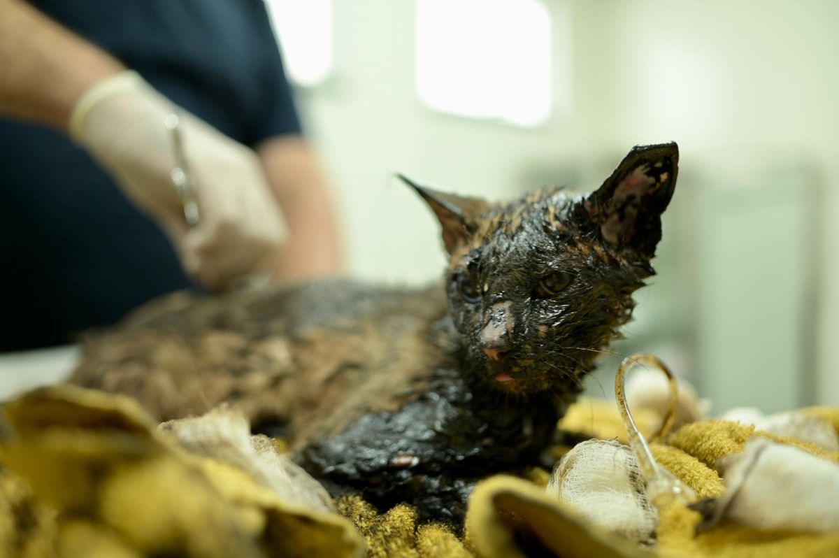 O veterinário, responsável pelo tratamento do animal, afirmou que estão priorizando as necessidades básicas do gato, que é comer, defecar e urinar, pois o breu do asfalto obstruiu essas vias, impedindo o animal de se alimentar direito.