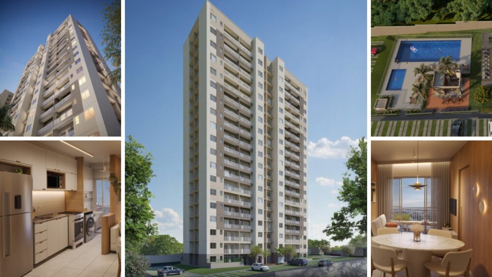 O condomínio será composto por 4 torres de 19 andares, oferecendo apartamentos de 2 quartos com varanda em duas opções de planta: