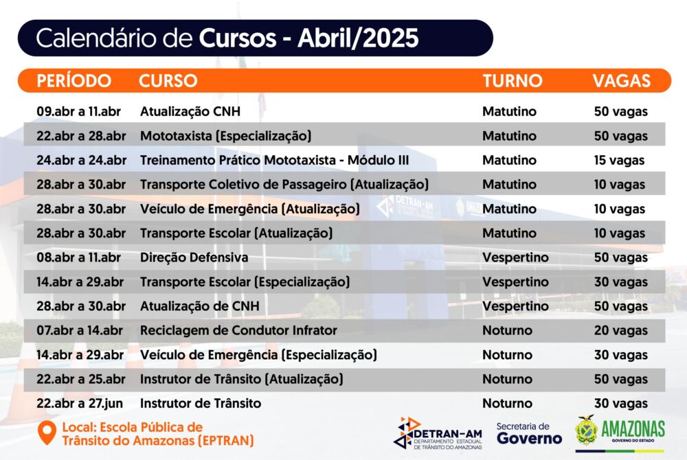 Oportunidade para quem deseja se atualizar ou se profissionalizar no setor de trânsito: o Departamento Estadual de Trânsito do Amazonas (Detran-AM), por meio da Escola Pública de Trânsito (Eptran), está com 405 vagas abertas em cursos gratuitos durante o mês de abril. As capacitações acontecem nos turnos matutino, vespertino e noturno, com algumas turmas aos sábados.