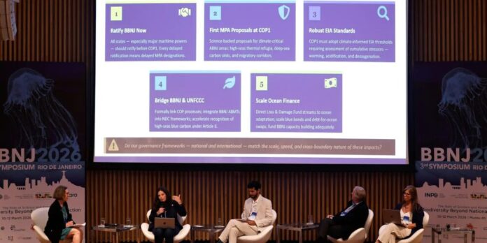 A professora defende uma maior integração entre o Tratado do Alto-Mar e a Convenção das Nações Unidas sobre Mudanças Climáticas (UNFCCC), argumentando que a governança atual pode não corresponder à escala e velocidade dos impactos climáticos.