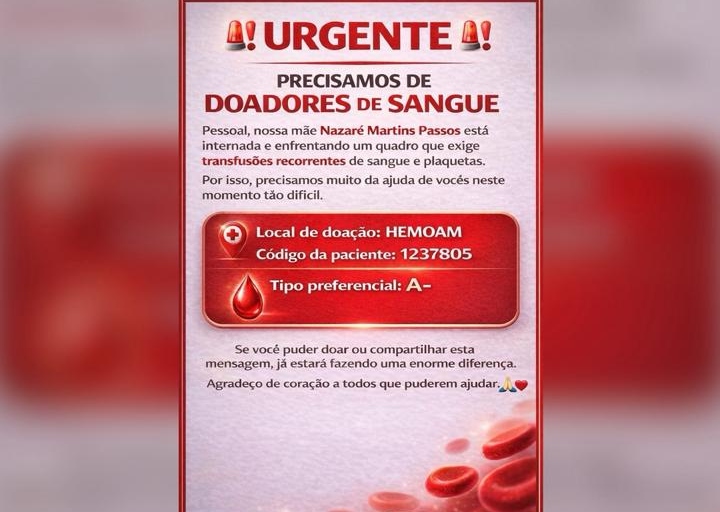 A mobilização é em apoio à paciente Nazaré Martins Passos, internada e em quadro de saúde que exige transfusões recorrentes de sangue e plaquetas. Familiares e amigos reforçam o pedido para que pessoas aptas a doar compareçam ao hemocentro.