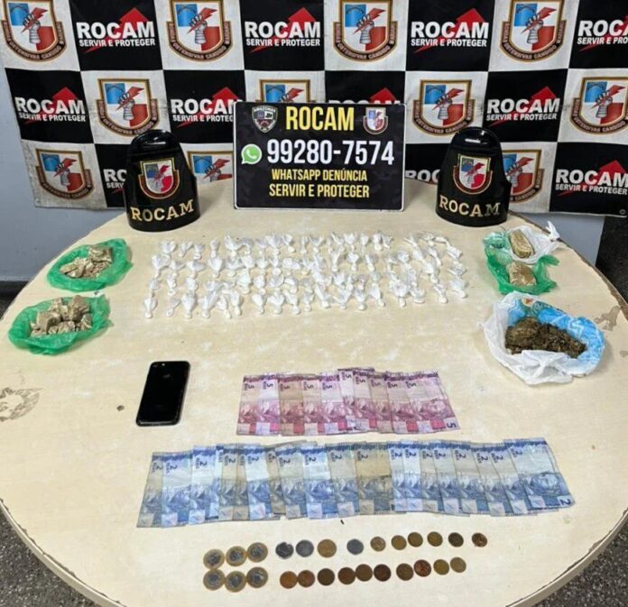 Na residência, com autorização para entrada, os policiais encontraram diversas porções de drogas, incluindo quatro porções médias de pasta-base de cocaína, uma porção média de maconha e 76 porções pequenas de cocaína. Além dos entorpecentes, foram apreendidos R$ 98,30 em espécie.