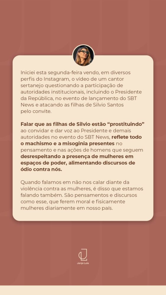 Em outro momento, Janja foi direta ao rebater a fala de Zezé envolvendo as filhas do fundador do SBT. “Falar que as filhas de Silvio estão ‘prostituindo’ ao convidar e dar voz ao Presidente e demais autoridades no evento do SBT News reflete todo o machismo e a misoginia presentes no pensamento e nas ações de homens que seguem desrespeitando a presença de mulheres em espaços de poder”, declarou.