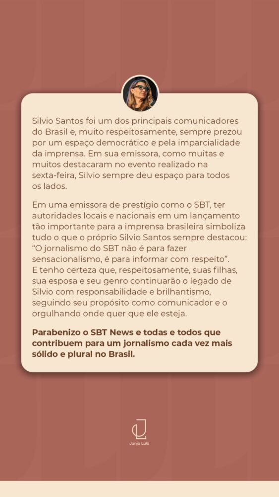 Em um dos trechos, Janja destacou o legado de Silvio Santos e a importância da pluralidade no jornalismo. “Silvio Santos foi um dos principais comunicadores do Brasil e sempre prezou por um espaço democrático e pela imparcialidade da imprensa. Em sua emissora, sempre deu espaço para todos os lados”, afirmou.