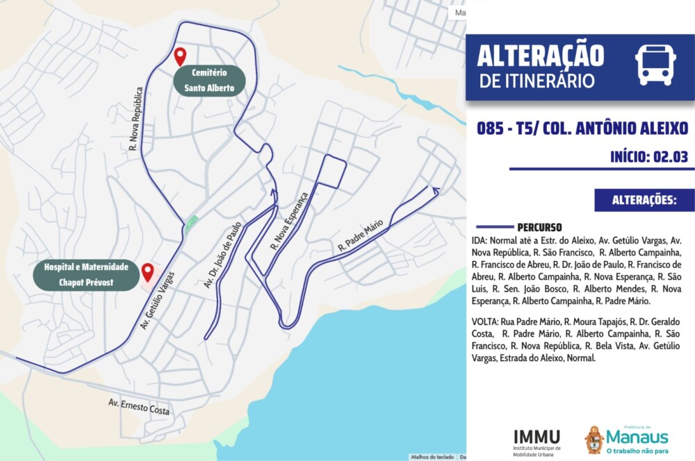 O Instituto Municipal de Mobilidade Urbana (IMMU), informa que a linha 085, que atende o bairro Colônia Antônio Aleixo com destino ao Terminal 5 (T5), terá seu itinerário alterado a partir de segunda-feira (2). A mudança foi definida em conjunto com lideranças comunitárias e moradores da região, com o objetivo de ampliar o atendimento dentro do bairro.