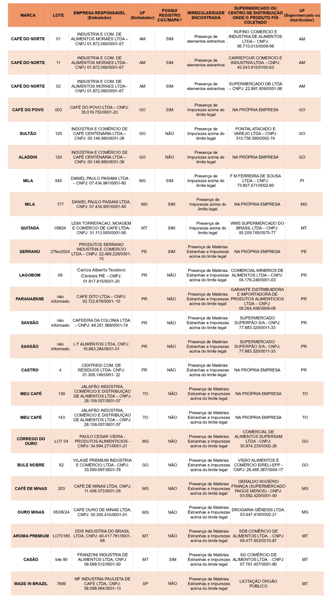 O Ministério da Agricultura e Pecuária divulgou na segunda-feira (1º) uma lista com 14 marcas de café torrado que foram consideradas impróprias para consumo humano após a constatação de impurezas ou de elementos estranhos acima dos limites permitidos pela legislação.