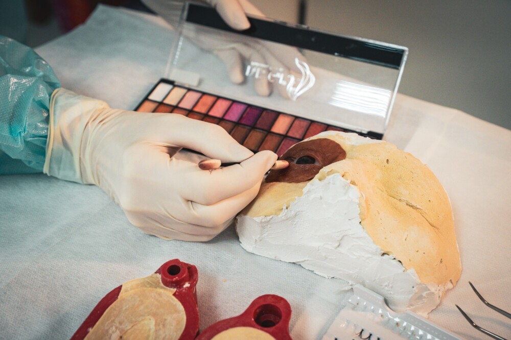 Quando ela envolve o olho e partes do rosto, são próteses conjugadas, com o olho feito em acrílico e a pele em silicone”, mencionou Brigitte, acrescentando que a colocação da peça envolve ainda mecanismos de retenção, para assegurar que a prótese permaneça fixa no lugar.