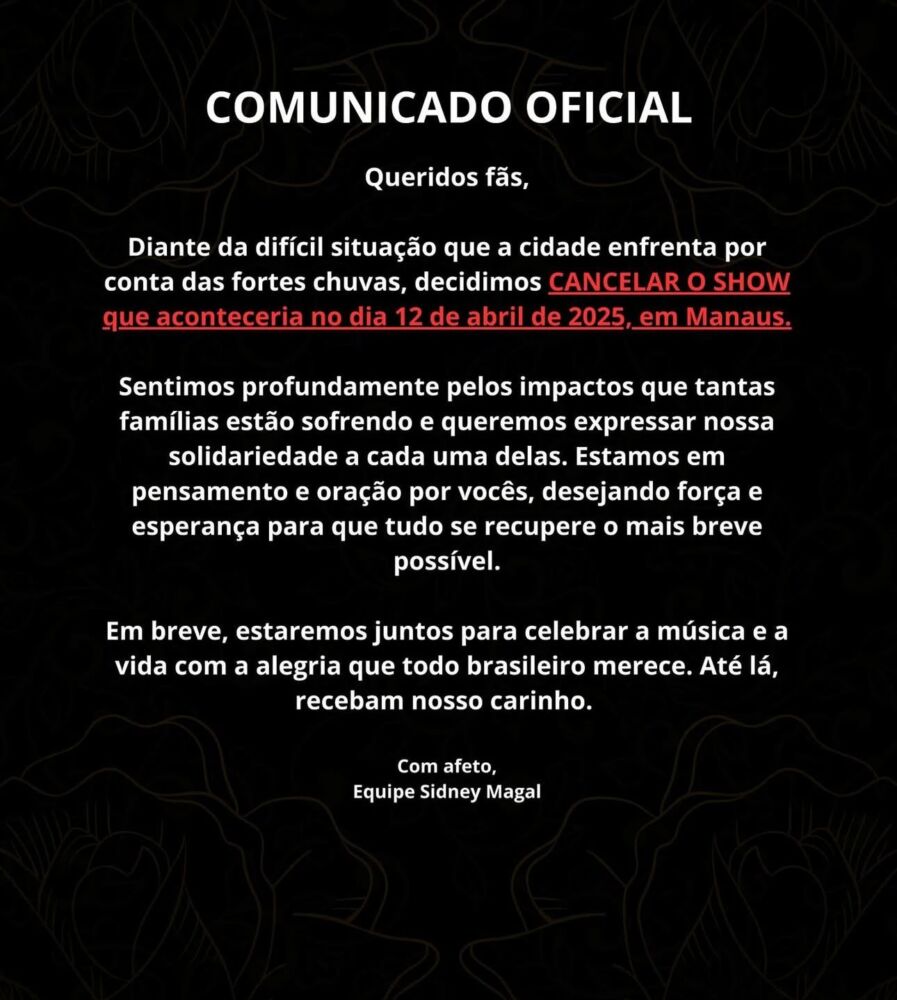 A equipe do artista divulgou um comunicado oficial, no qual expressa preocupação com a situação enfrentada pelos moradores de Manaus. No texto, Magal e sua equipe enviam mensagens de força e esperança, desejando que a cidade se recupere o mais breve possível.