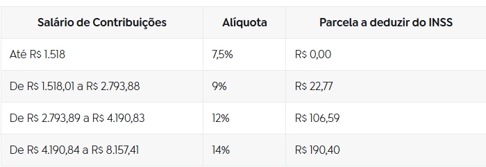 A correção de 4,77% também incidirá sobre a tabela do INSS, por meio da qual os trabalhadores da iniciativa privada com carteira assinada e de empresas estatais recolhem as contribuições mensais à Previdência Social. As alíquotas e as faixas de dedução vão incidir sobre as seguintes faixas: