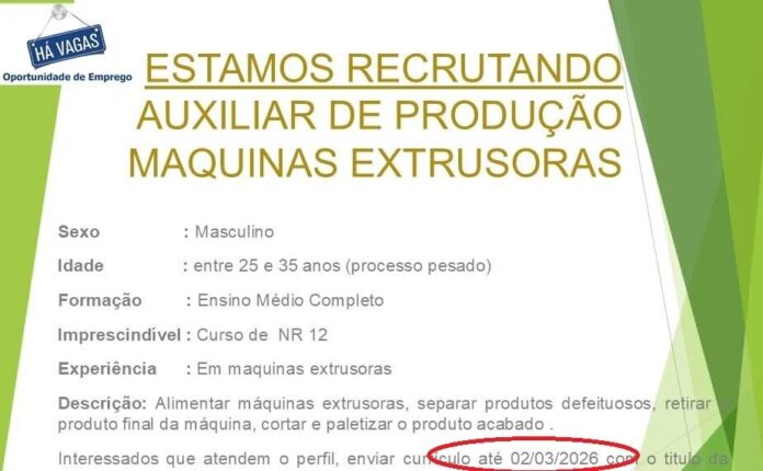 Os candidatos devem ter experiência prévia com máquinas extrusoras. As principais responsabilidades do cargo incluem alimentar as máquinas extrusoras, realizar a separação de produtos defeituosos, retirar o produto final da máquina, além de cortar e paletizar o produto acabado.