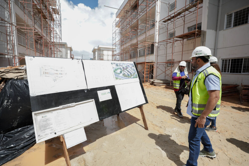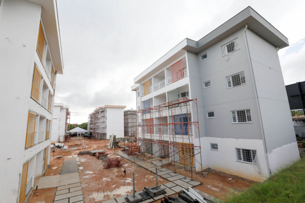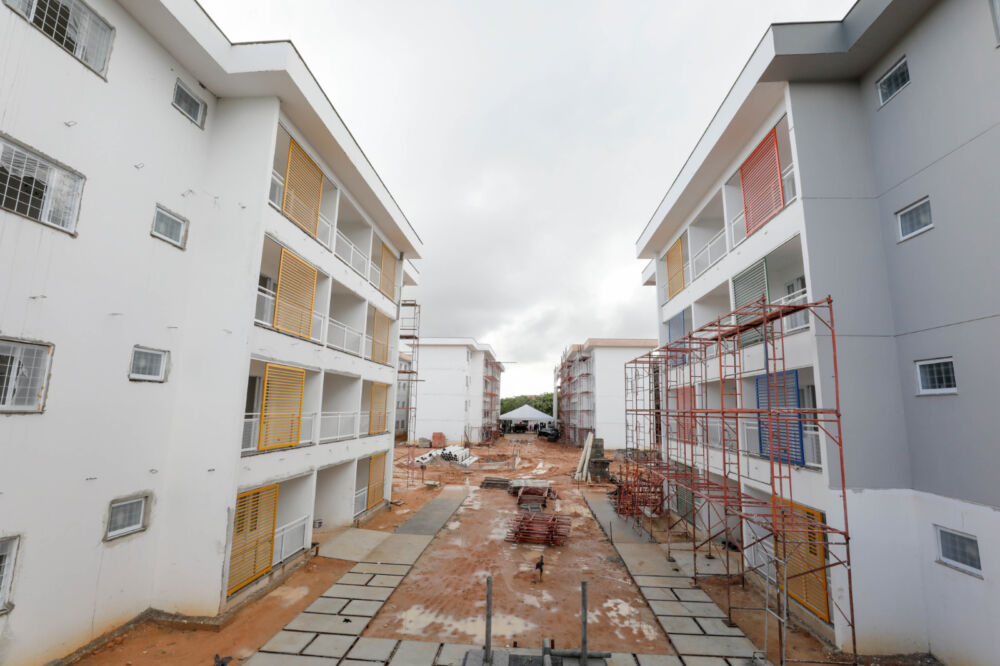 As obras do novo conjunto habitacional estão em fase final, com serviços de acabamento externo dos últimos blocos. As intervenções estão concentradas no assentamento de cerâmicas, aplicação de revestimentos e colocação de esquadrias e arremates nos blocos, além de execução de drenagem e esgoto externo.